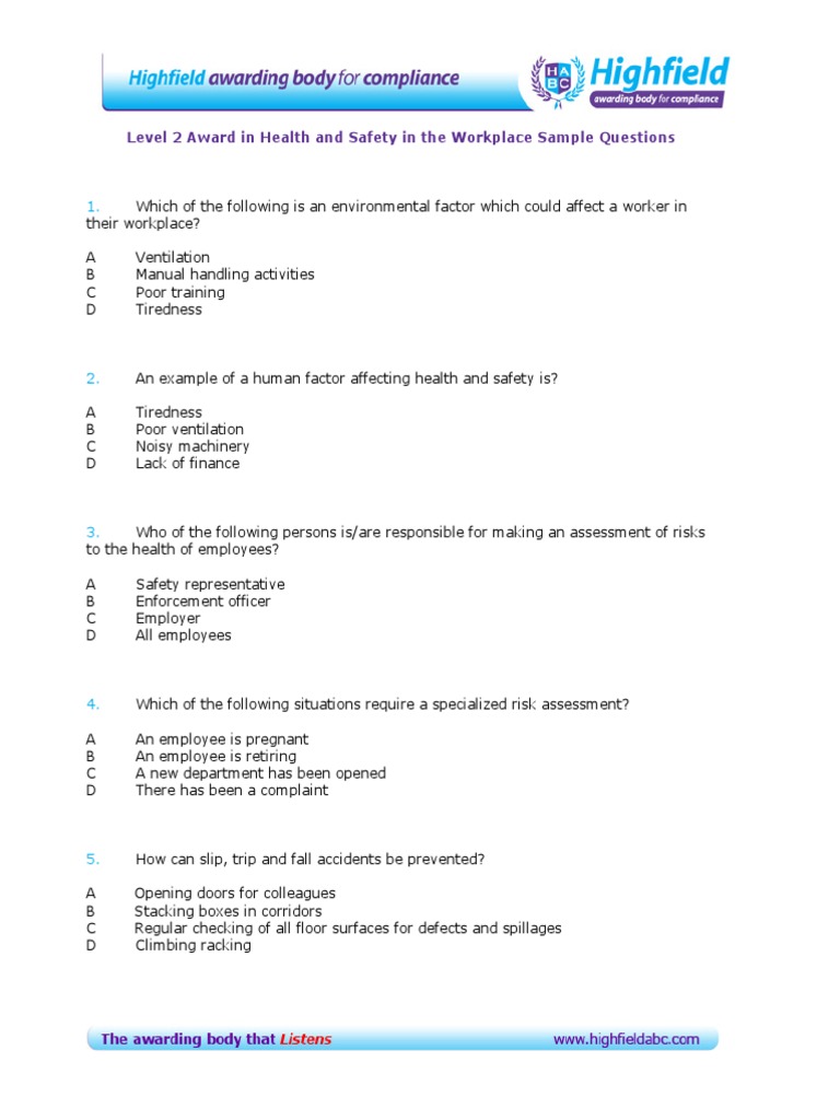 Level 6 Health And Safety Answers - Health Safety Quiz Questions Answers For Employees - Responsibilities of a care worker.. Environment and the safety of human life. More health safety and environment hse test and cards. You should use this information to answer questions in your own words. Health and safety is a very serious subject. All people should be given the highest level of protection against risks to their health and safety that is reasonably practicable in the circumstances.